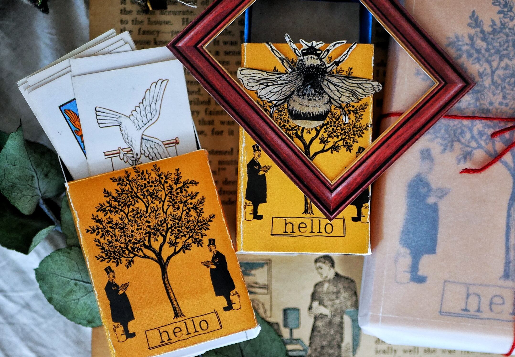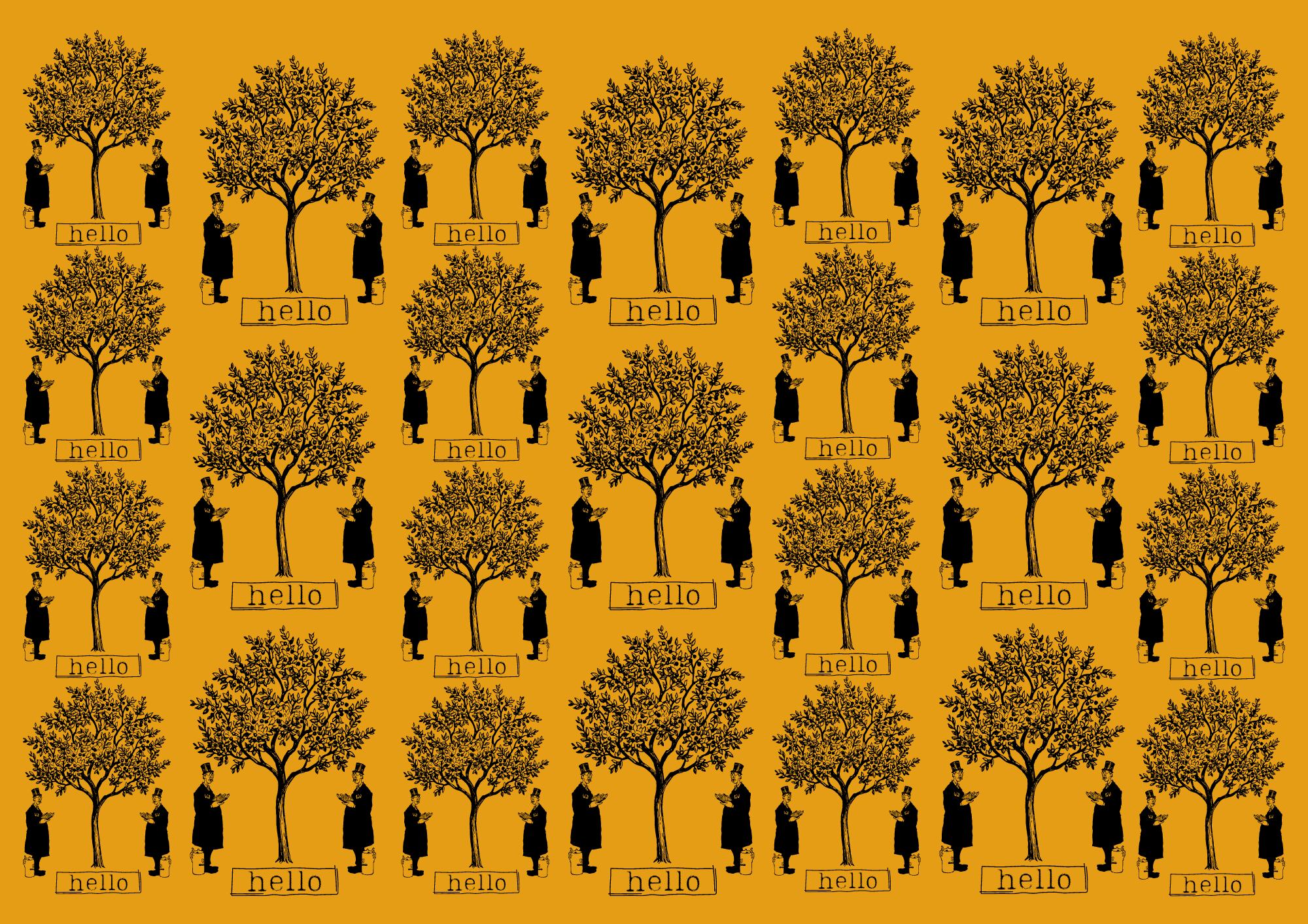 表面は、からし色のペーパーをベースに紳士や樹木をレイアウトしたデザイン、