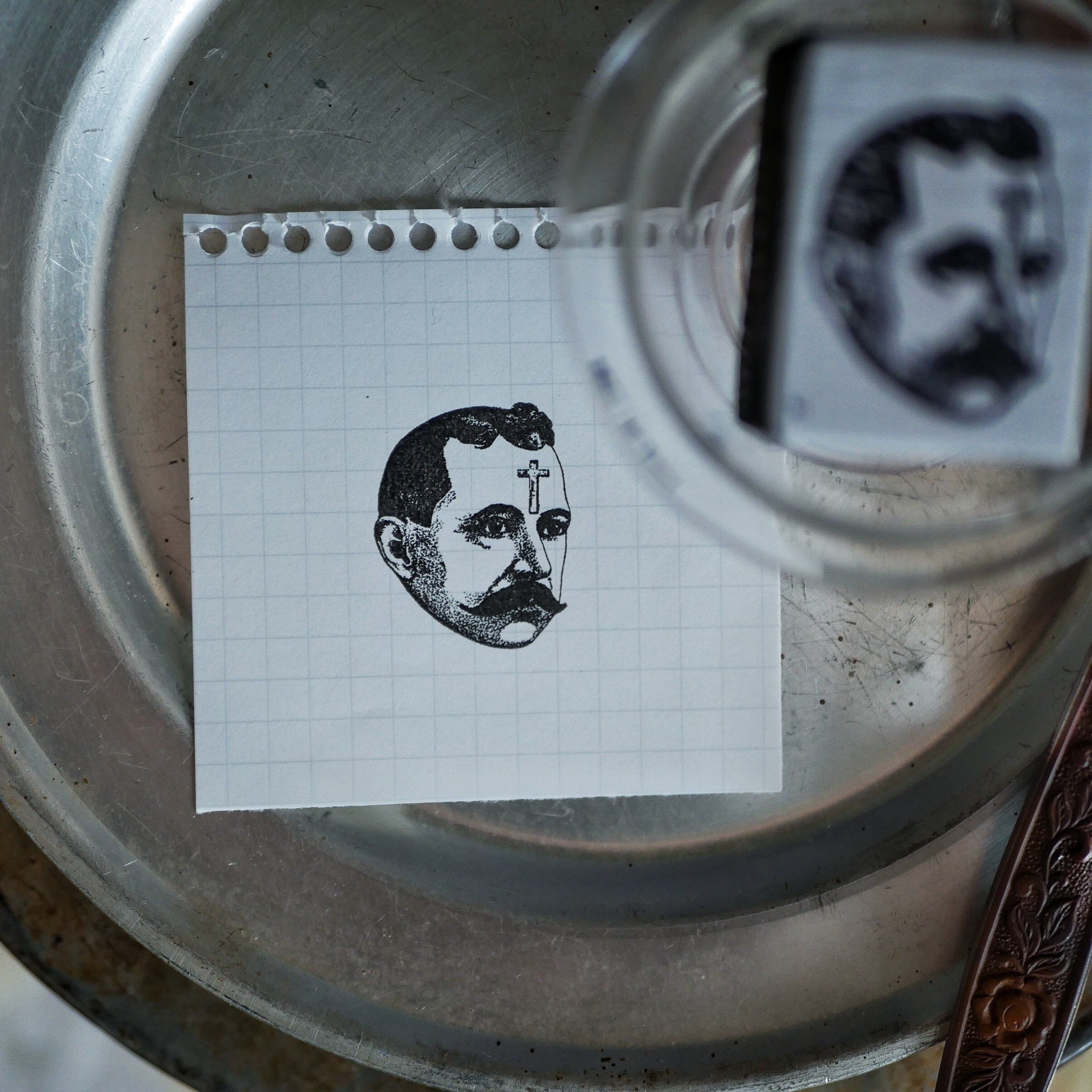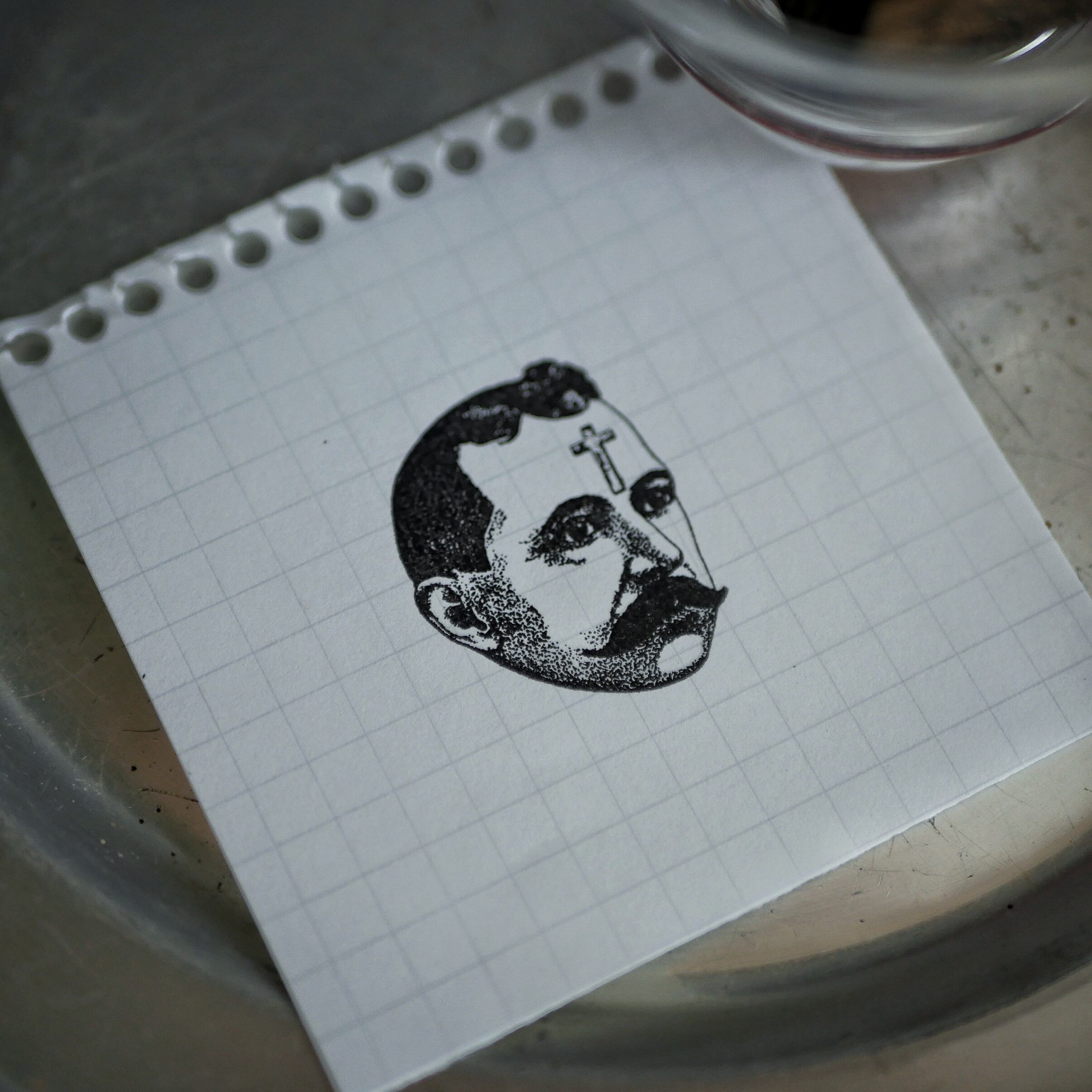 口元には髭を蓄え、ぱっちりした目でどこかを見つめ、おまけに額には十字架。