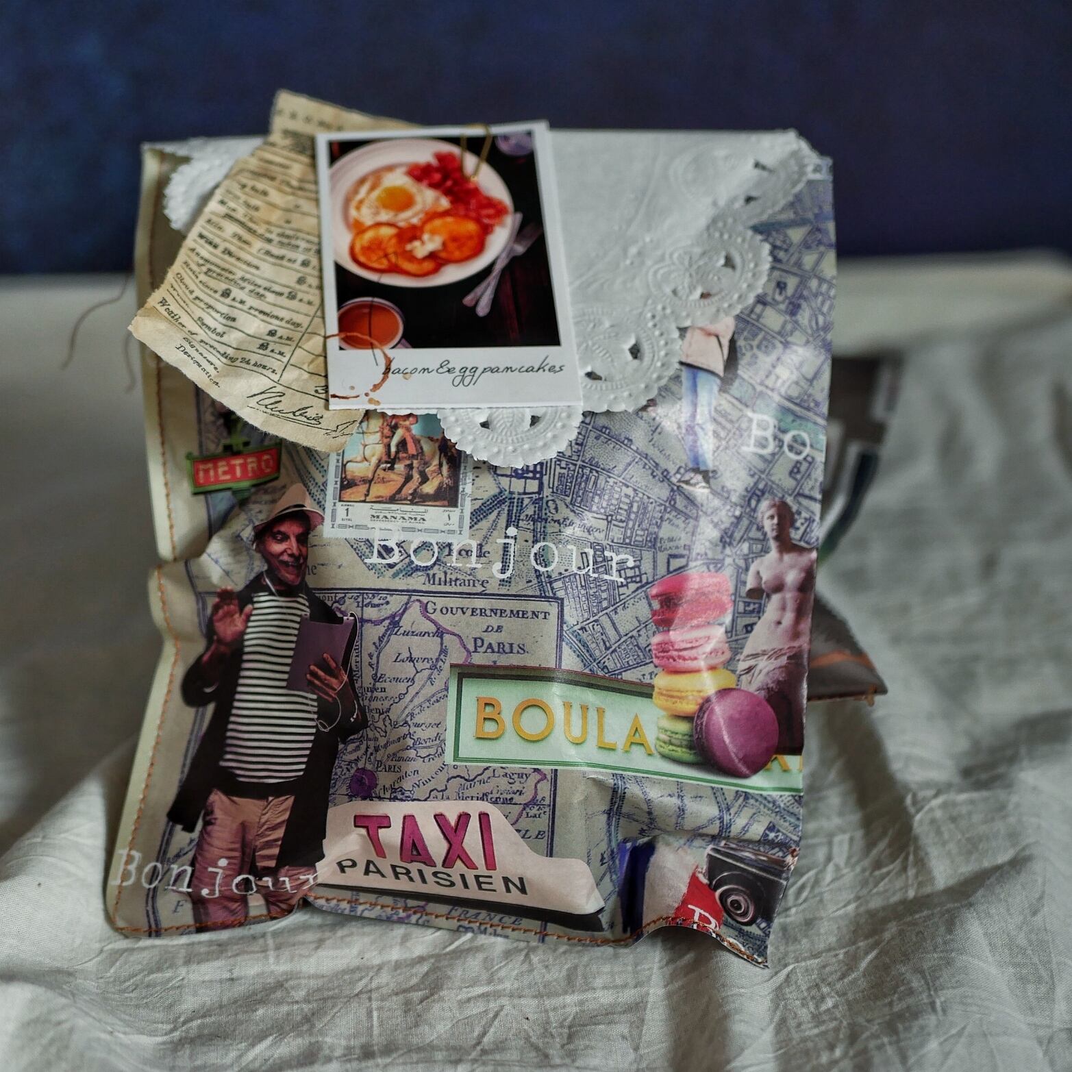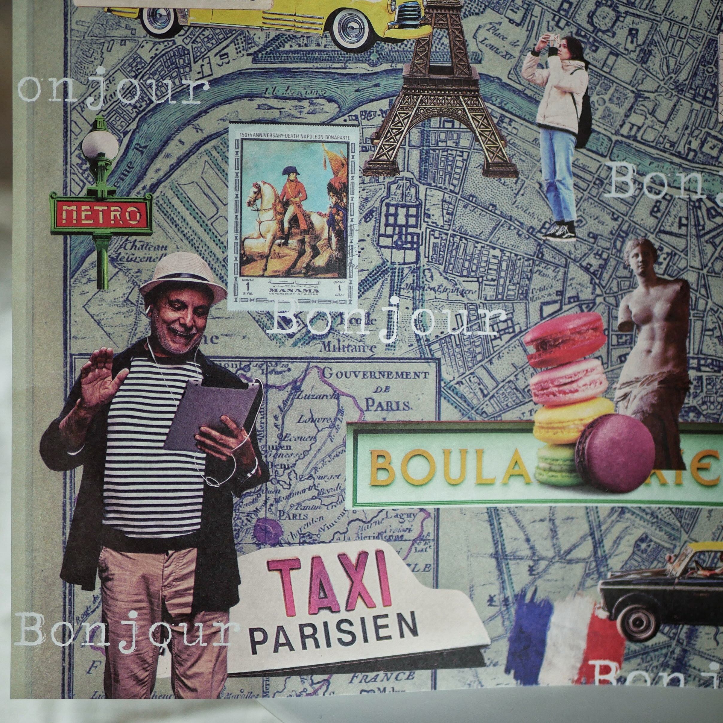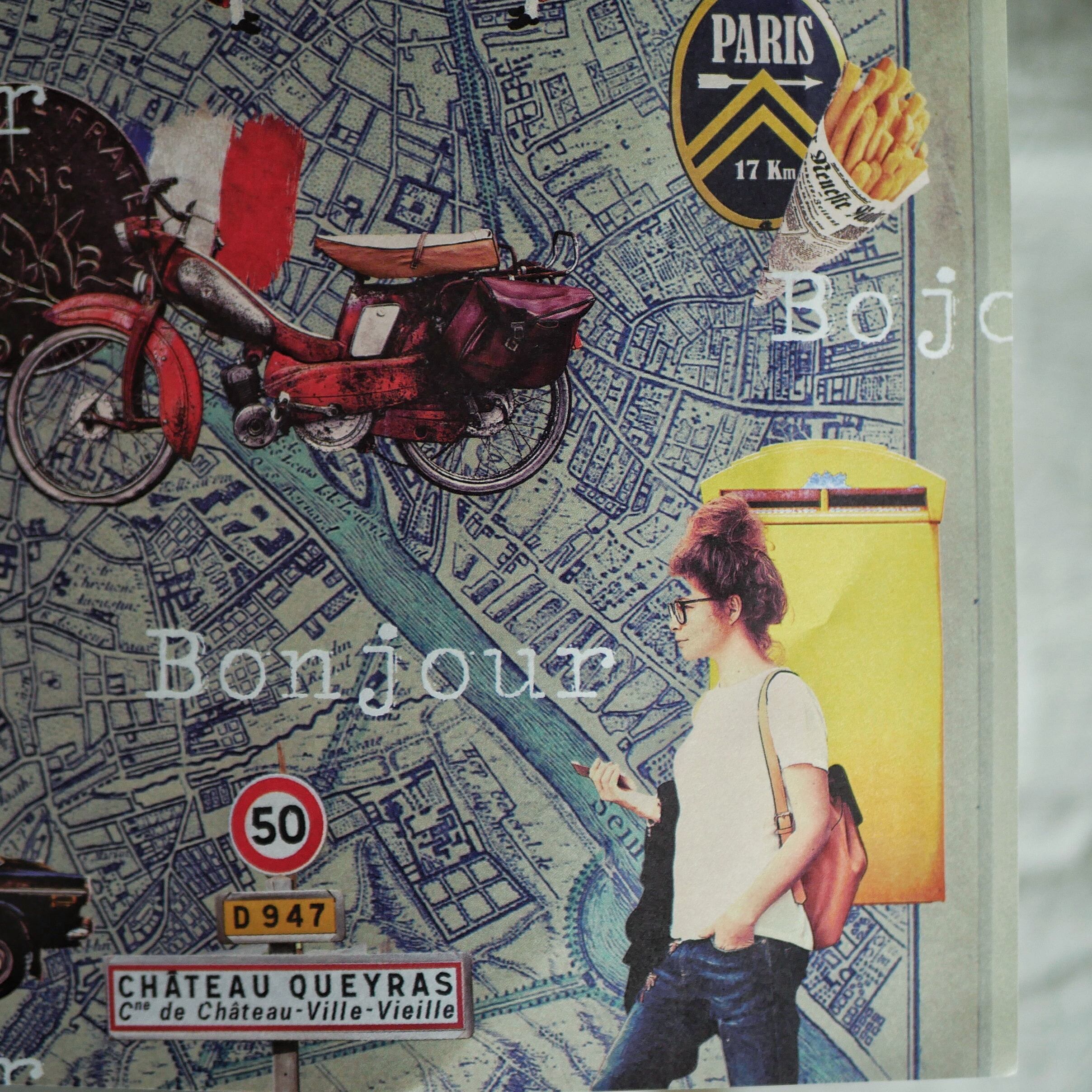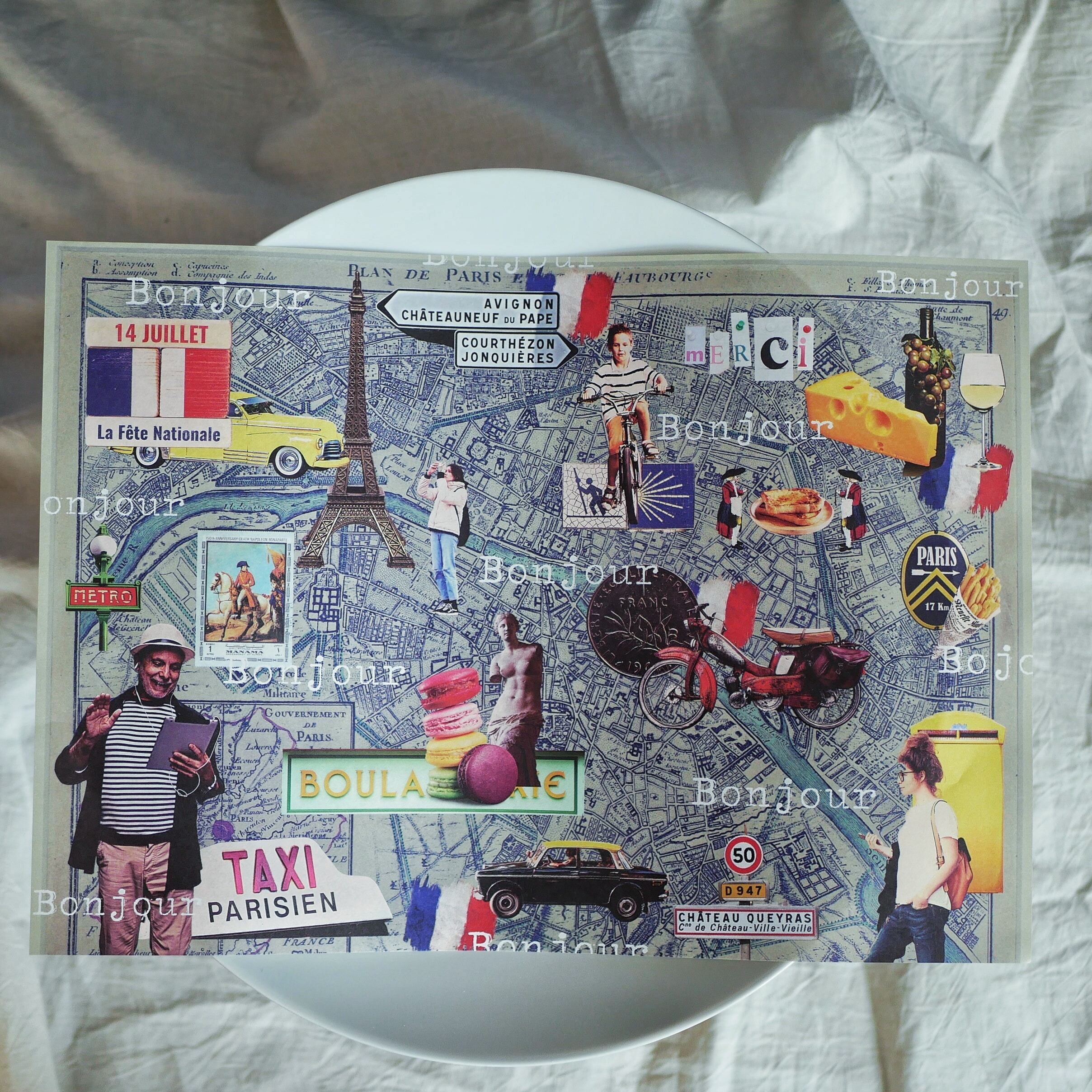 フランス市街地の地図上に、エッフェル塔やパリジェンヌ、美味しそうなワインやチーズなどを配置したデザインのペーパー。