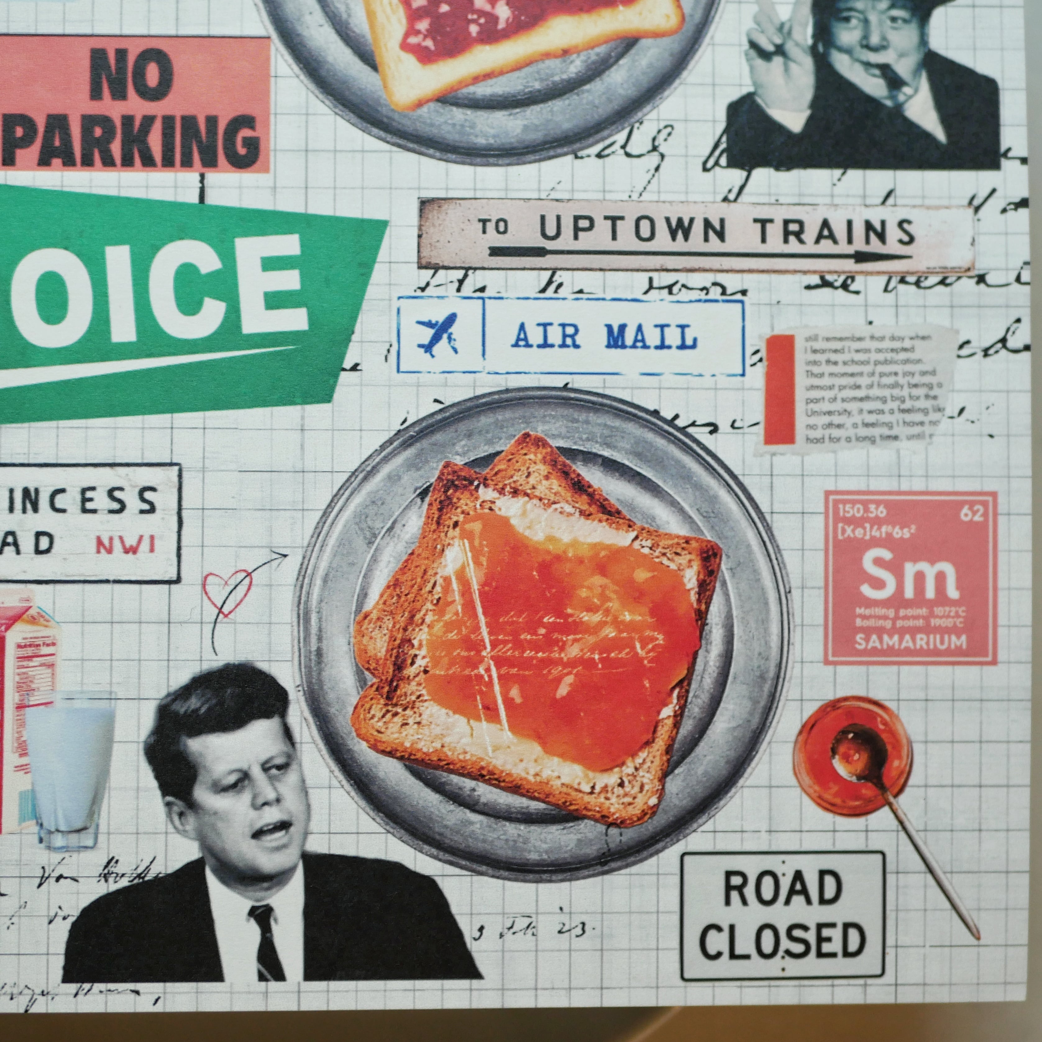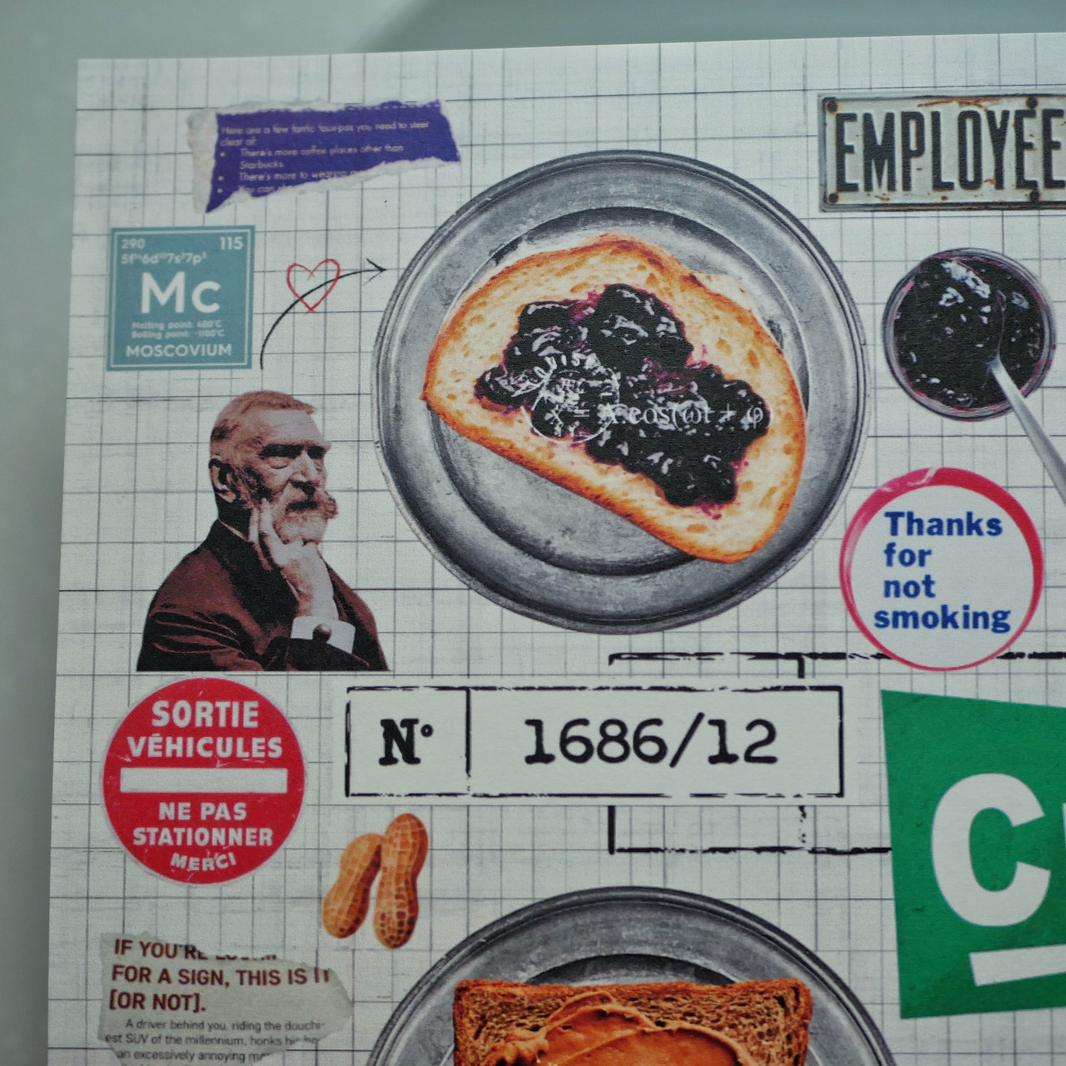 いちごジャム、マーマレードジャム、ブルーベリージャム、それにピーナッツバター!が塗られたパンの横には、それを好むであろう人物をランダムに配置したデザインペーパー。