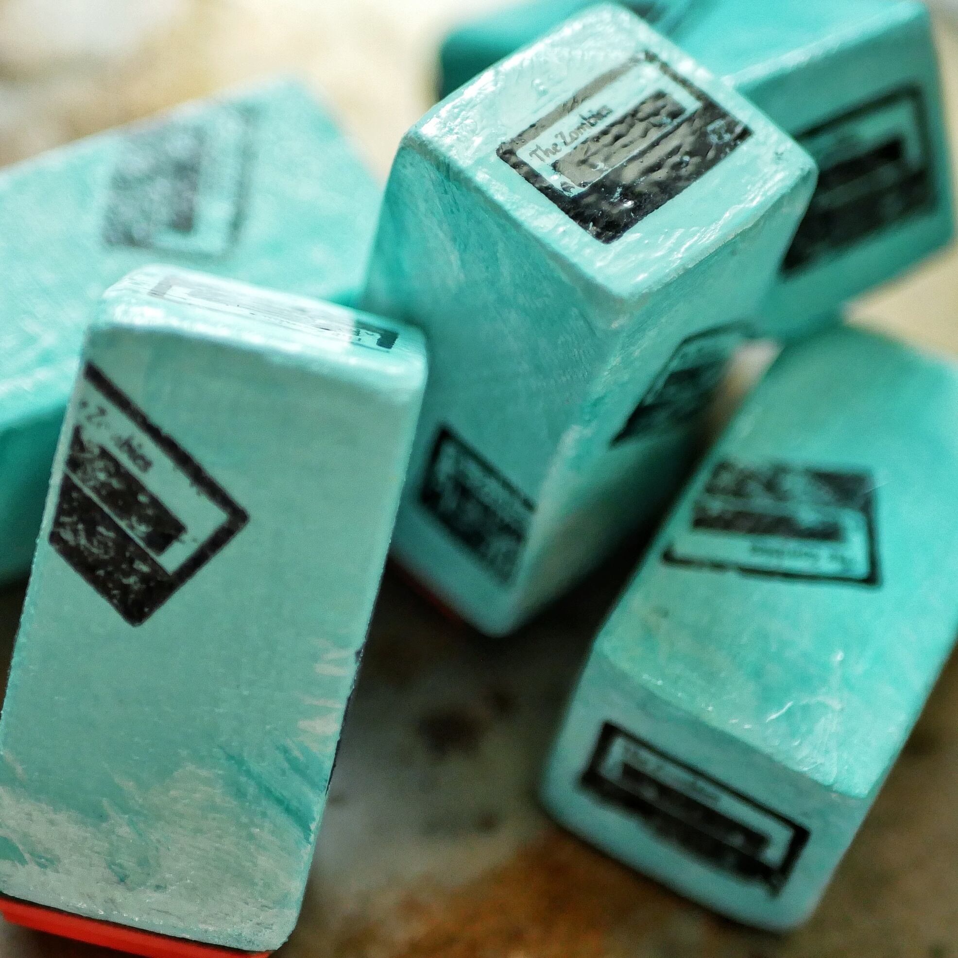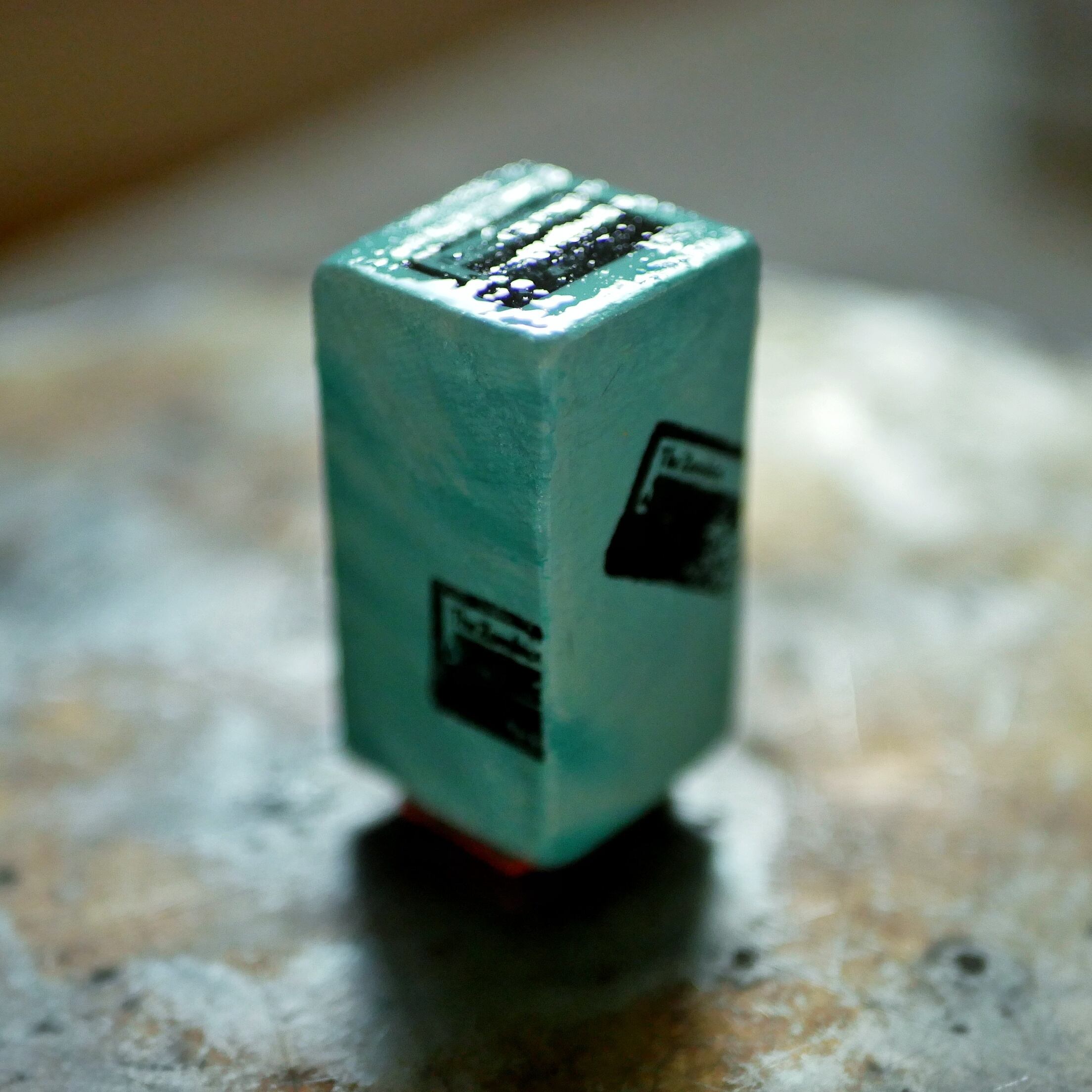 持ち手部分は、淡いグリーンで塗装した木製スタンプ。