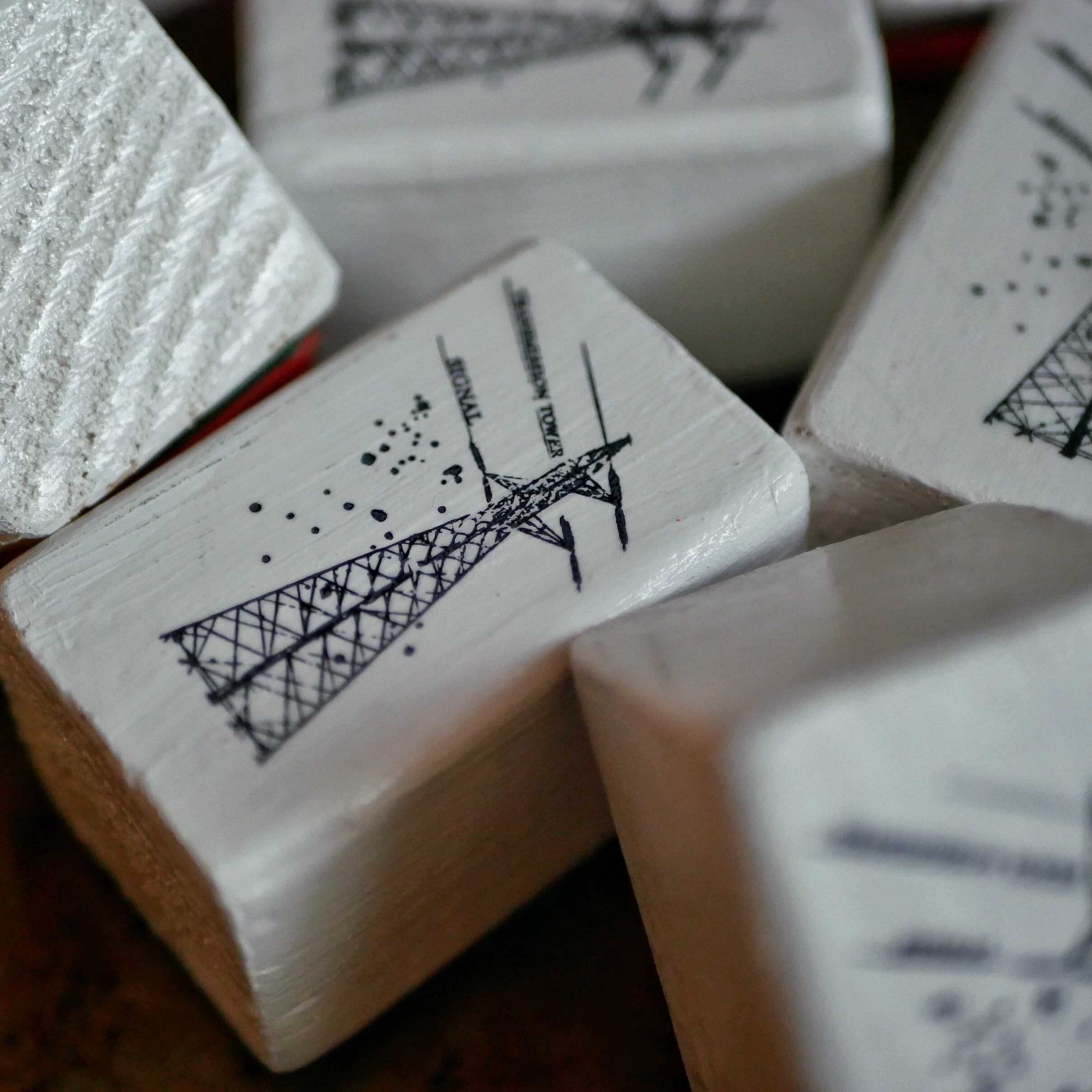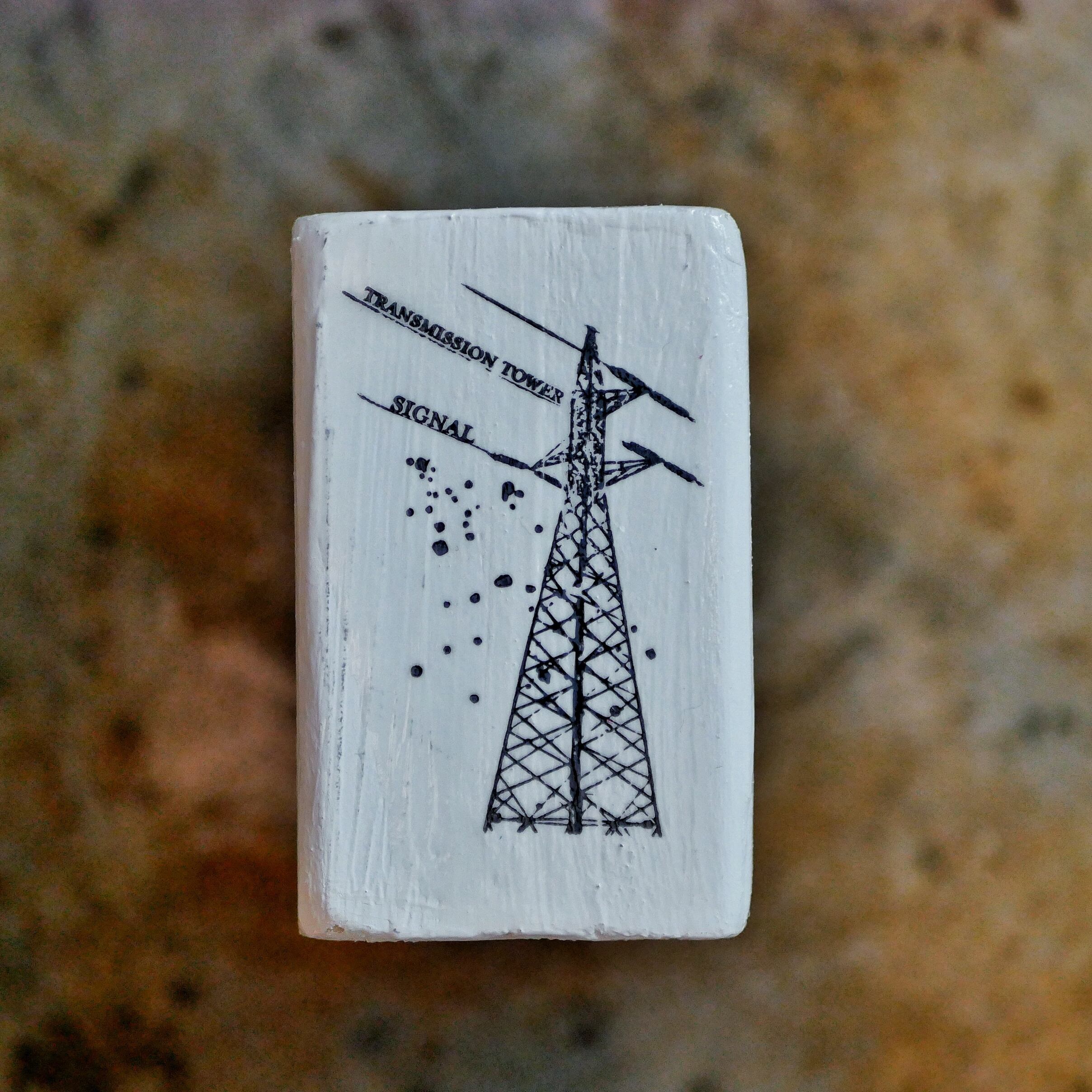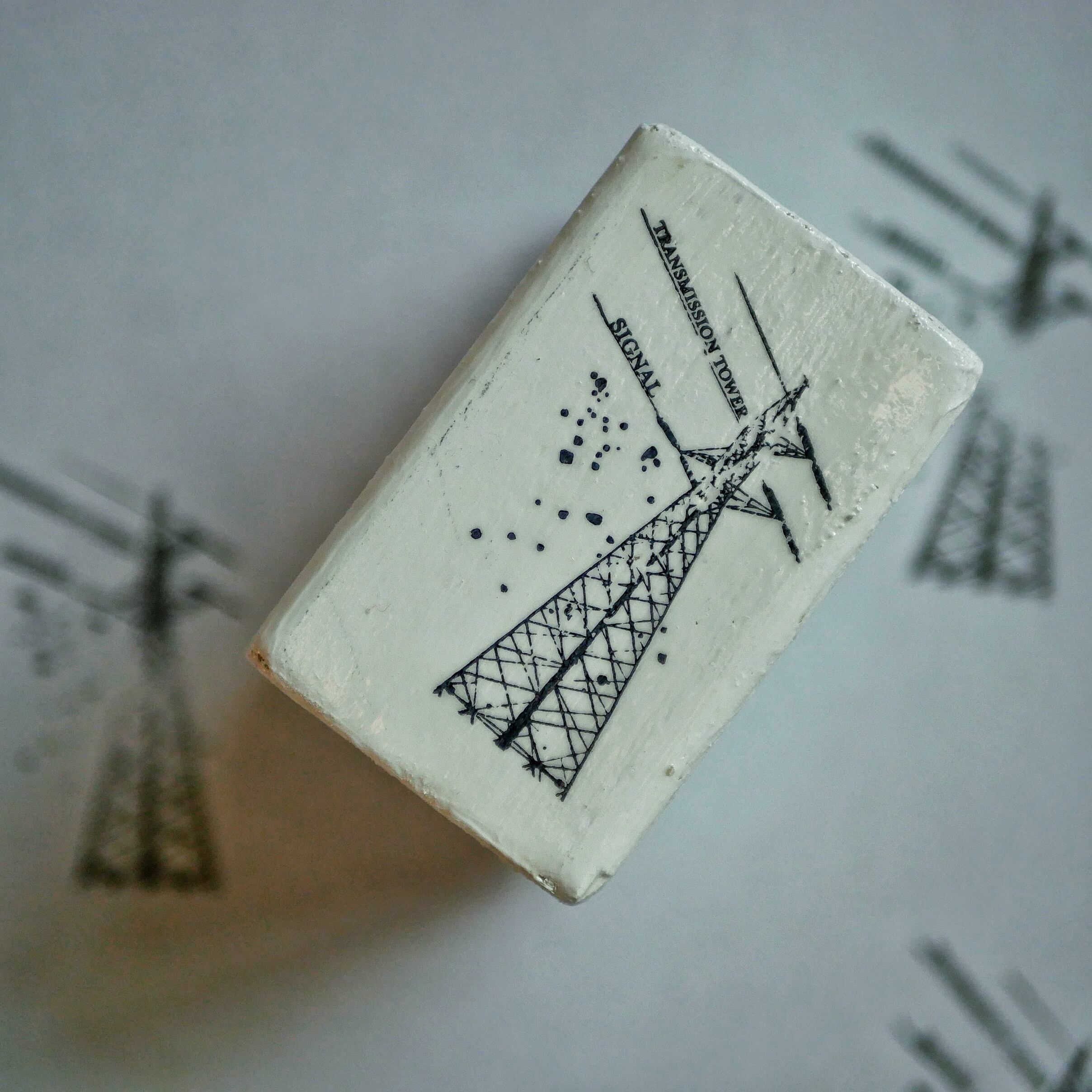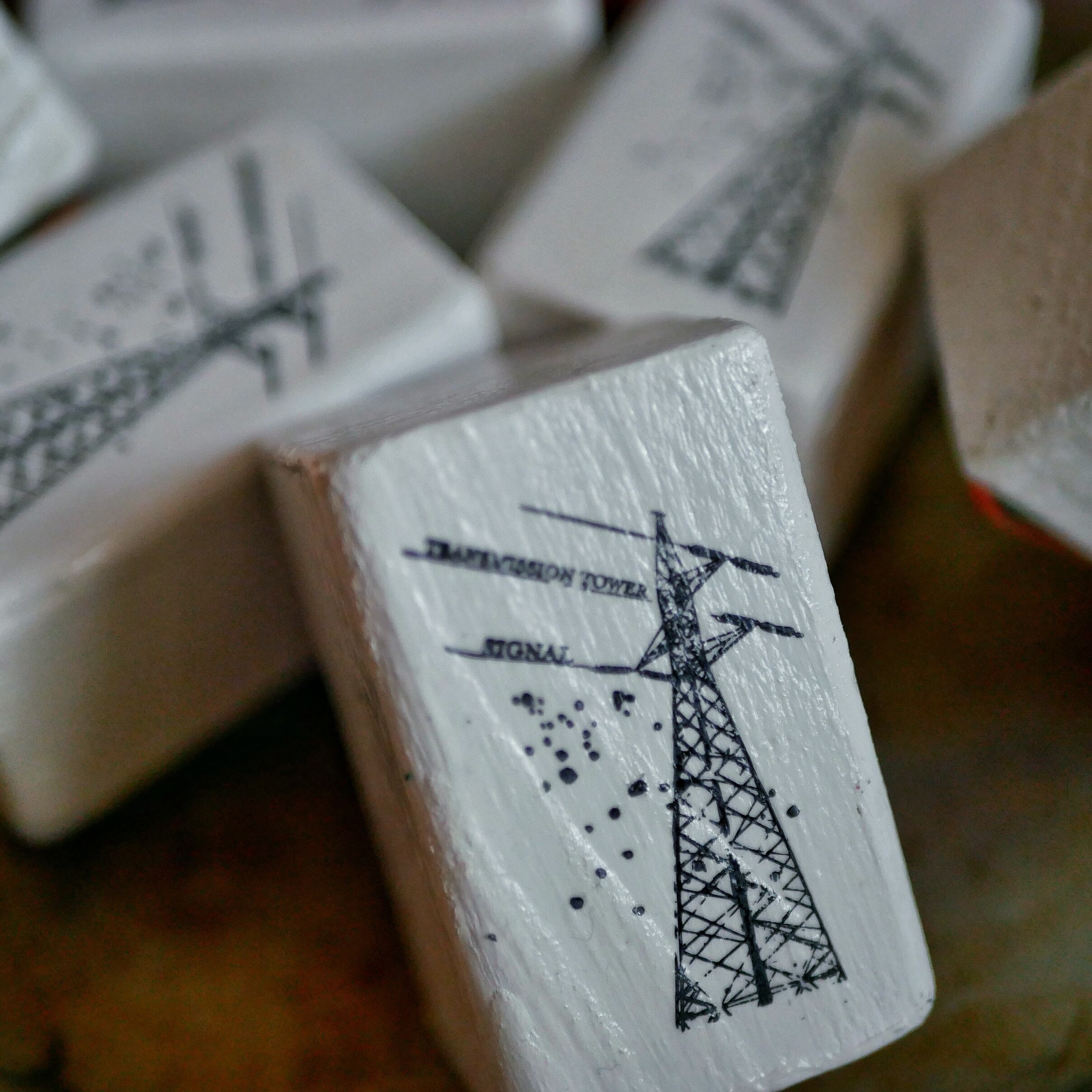 限りなく無機質で実用的な送電鉄塔。山の稜線沿いに等間隔で並んだ鉄塔群が夕陽を浴びて佇む姿は、最高に美しい光景です。スタンプ持ち手部分は真っ白に塗装し、ヘッドの鉄塔がより際立つように仕上げたスタンプです。